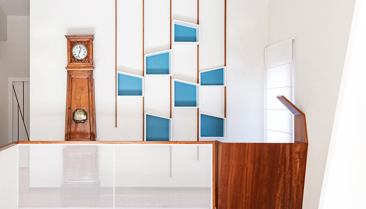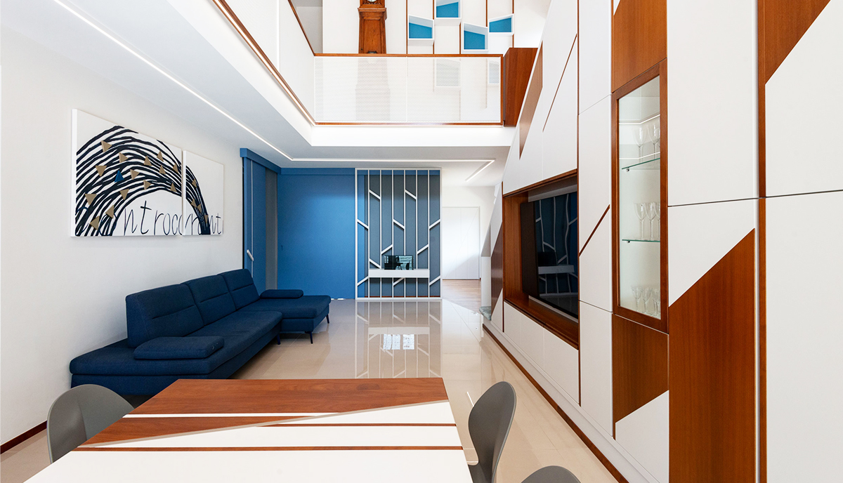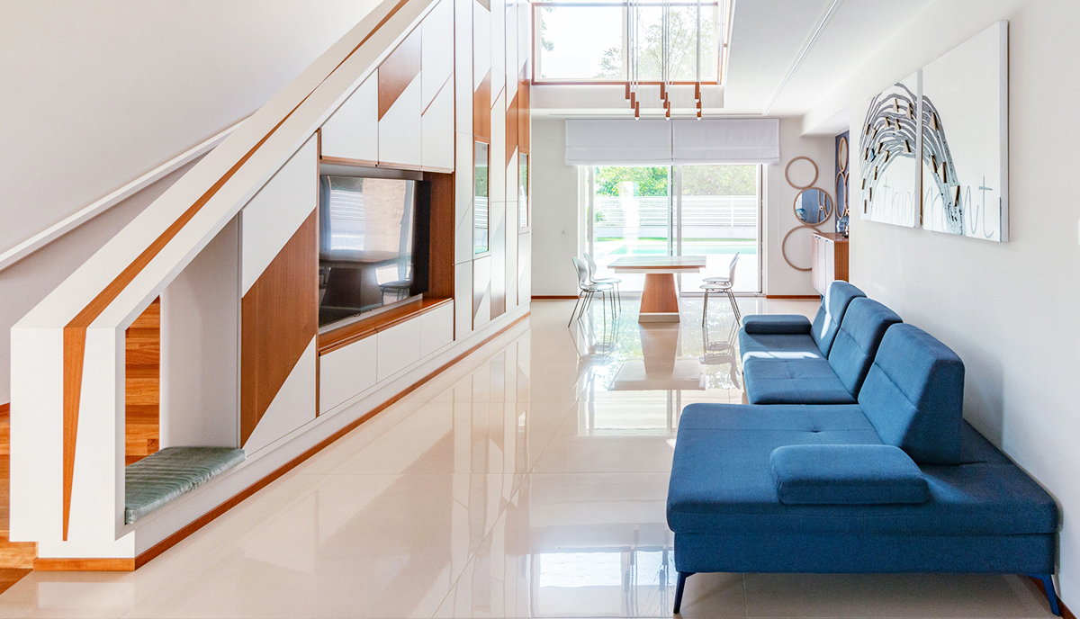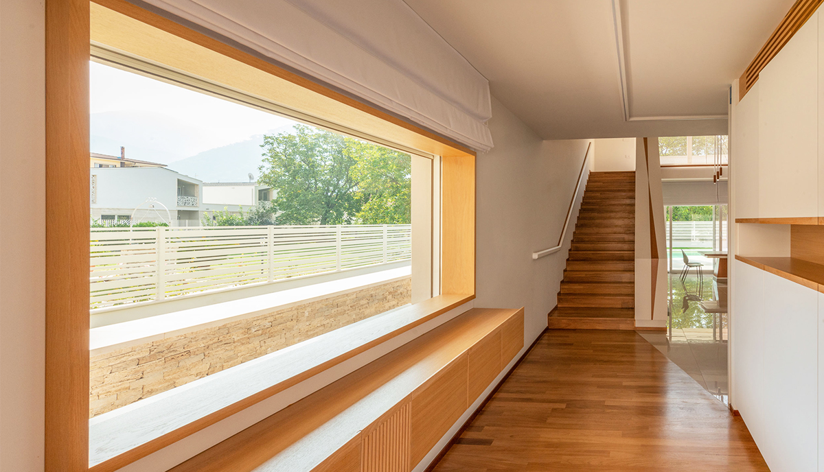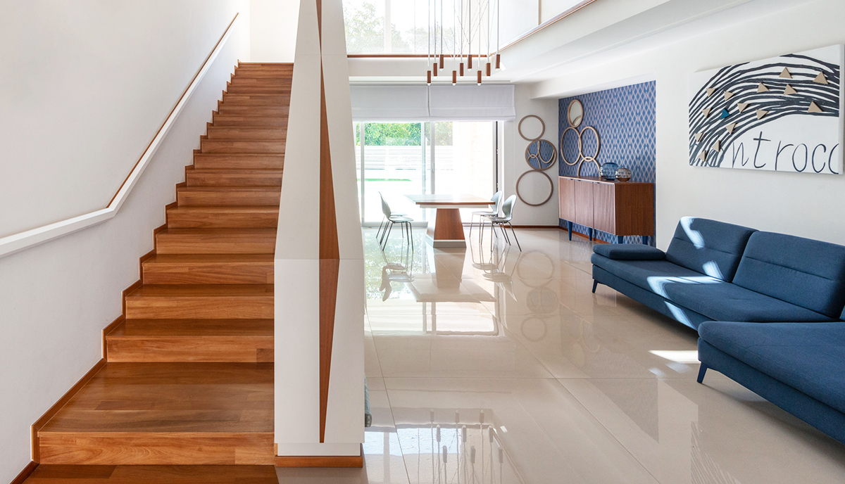 Luce e dinamicità contraddistinguono gli interni della villa MC dove arredi e complementi sono stati progettati e realizzati su misura.