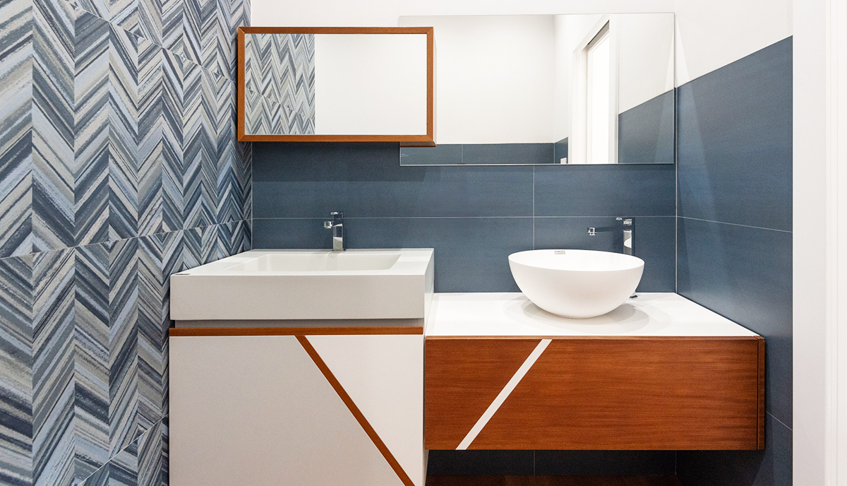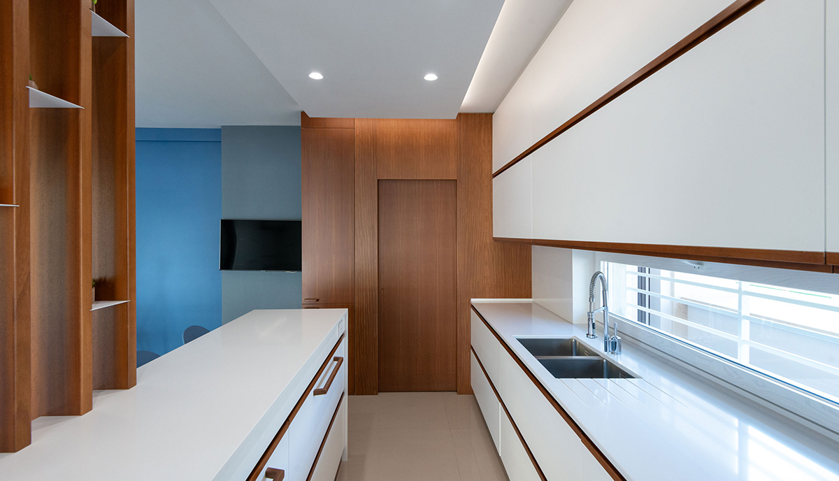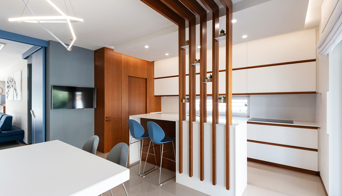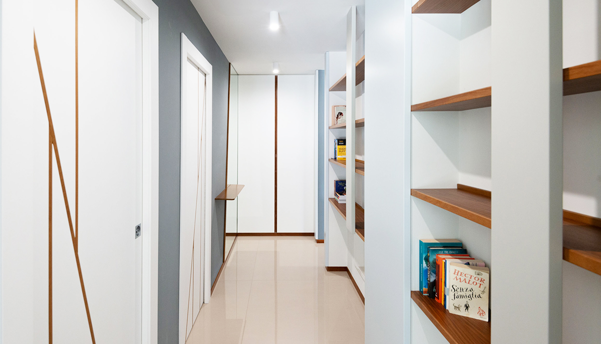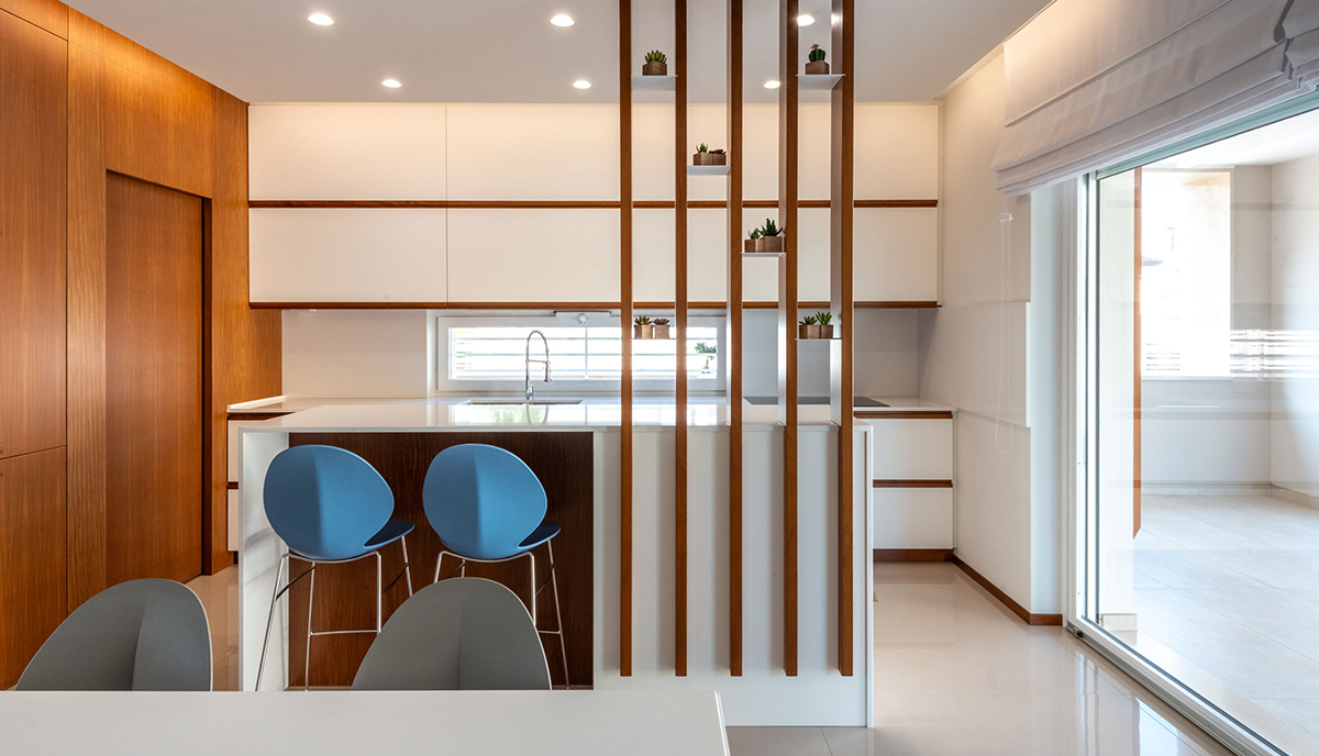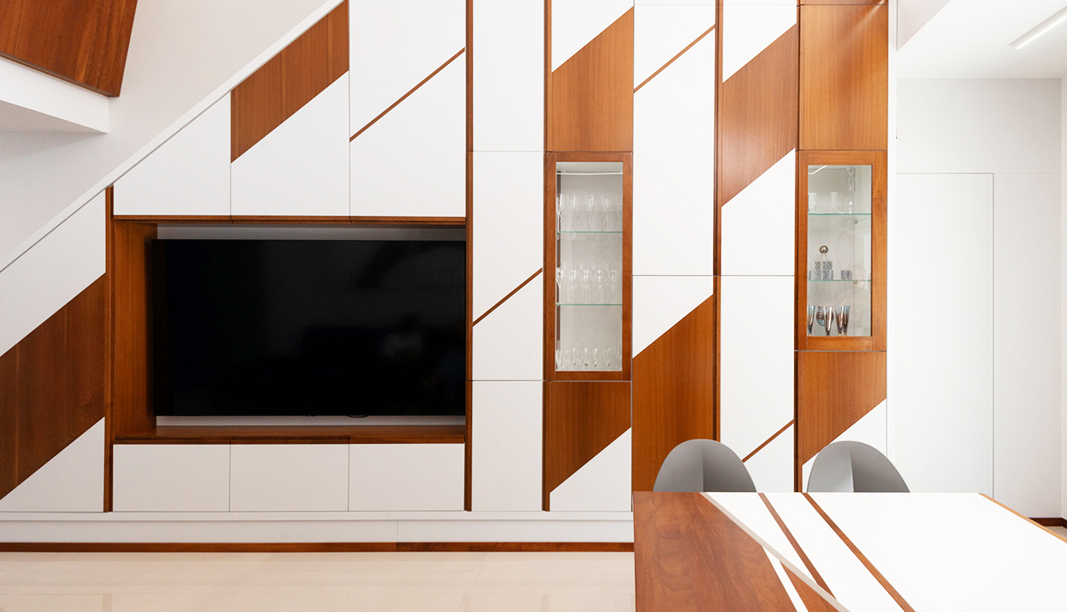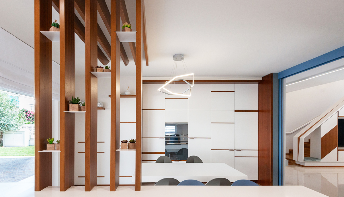 Gli inserti in legno che si stagliano sullo sfondo bianco lucido sono il motivo ricorrente che crea un forte contrasto visivo.